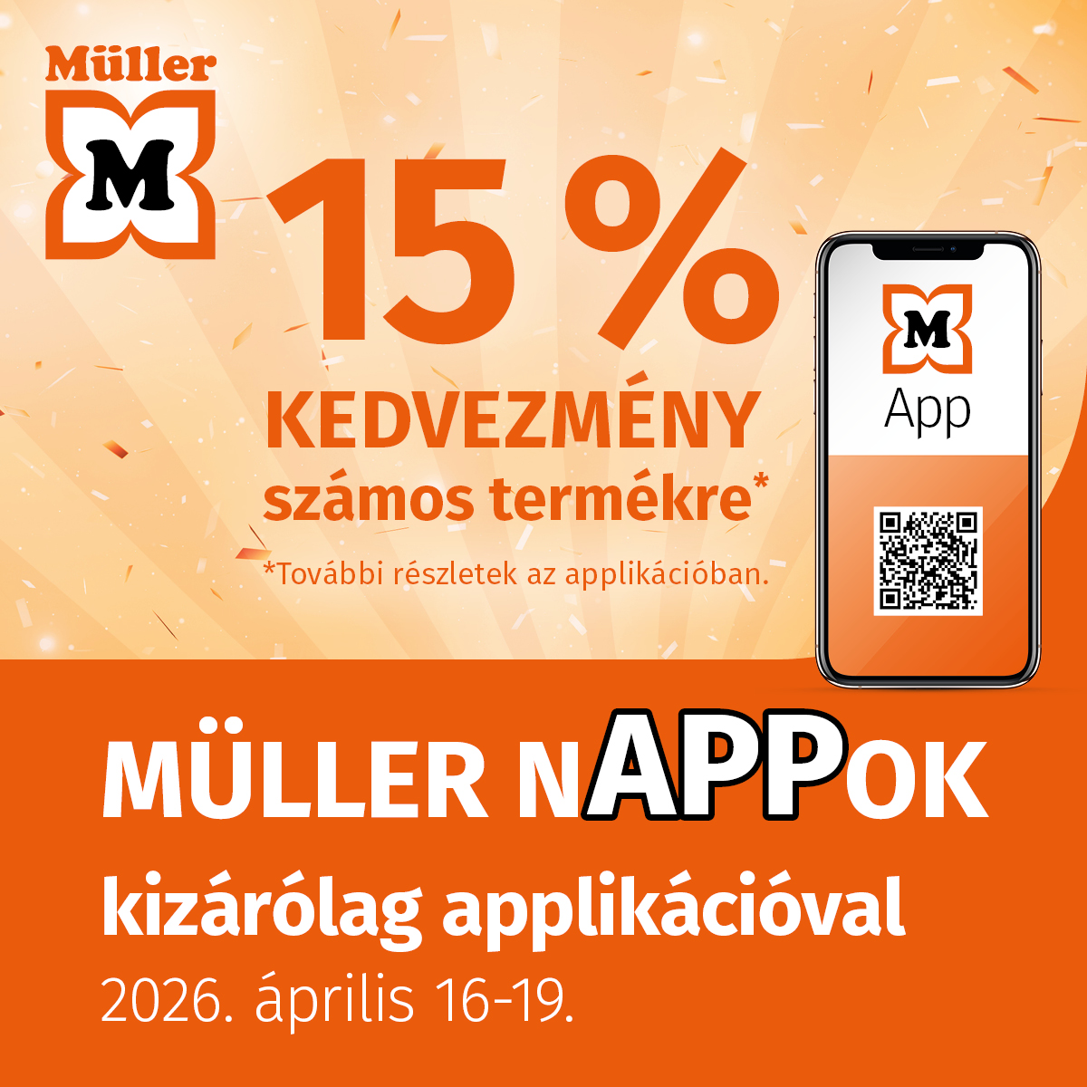 15% végösszegi kedvezmény Müller applikációval számos termékre!*